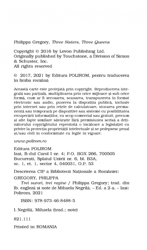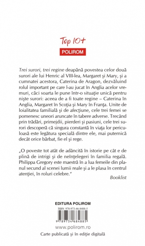 Comandă online cartea "Trei surori, trei regine (ediție de buzunar)" la 36,90 lei isbn 9789734684885 scrisă de Philippa Gregory, tiparită la editura Polirom face parte din colecția Top 10+. Cartea poate fi livrată în circa 2 zile cu plata ramburs sau online cu cardul.