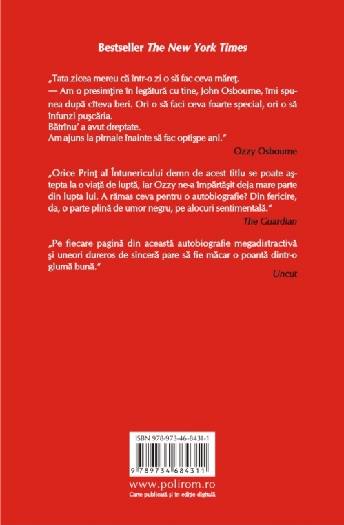 În stilul său colorat şi spumos, Ozzy Osbourne, o legendă a rockului, îşi deapănă incredibila poveste de viaţă, de la copilăria petrecută în sărăcie şi adolescenţa marcată de o condamnare la închisoare pînă la anii celebrităţii, presăraţi cu abuzuri, accese de violenţă şi accidente aproape mortale. Pendulînd între tragic şi comic, povestea începe în Aston, un orăşel industrial dezolant din Marea Britanie, unde tînărul John Osbourne încearcă să-şi facă un viitor şi să cîştige un ban mai întîi ca muncitor în fabrică şi în abator, apoi dînd spargeri mărunte. După un şir de eşecuri, Ozzy se îndreaptă spre muzică, unica lui şansă de-a fenta destinul sumbru ce-i aşteaptă pe majoritatea locuitorilor din Aston. Cititorii vor fi martorii începuturilor trupei Black Sabbath şi ai transformării lui Ozzy în starul rock care a vîndut peste o sută de milioane de discuri. Dincolo de strălucirea celebrităţii, muzicianul vorbeşte cu regret despre latura întunecată a personalităţii sale: dependenţa de alcool şi droguri, predilecţia pentru arme şi cruzimea faţă de animale.