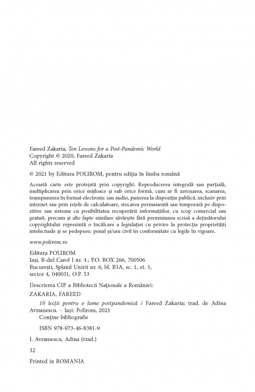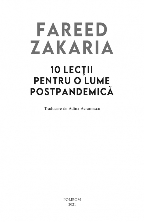Cartea jurnalistului american Fareed Zakaria e una dintre primele încercări de a creiona lumea care ne aşteaptă după ce va trece vîrful crizei provocate de pandemia de COVID-19. Analiza porneşte de la premisa că asistăm la unul dintre acele rare momente în care istoria îşi accelerează ritmul şi că această criză ce a afectat toate aspectele vieţii umane va reconfigura într-o măsură semnificativă lumea. Cele 10 „lecţii” care compun cartea acoperă toate domeniile, în primul rînd politica, dar şi tehnologia, economia ori viaţa noastră socială. Autorul argumentează că vom fi nevoiţi să ne reconsiderăm opiniile despre ceea ce înseamnă o guvernare eficientă, că, foarte probabil, domenii precum sănătatea şi educaţia vor ieşi de sub dominaţia absolută a pieţei, că globalizarea va căpăta un nou statut, mult mai ambiguu, şi că vor avea loc o creştere a autorităţii experţilor, dar şi o accentuare a inegalităţilor. 10 lecţii pentru o lume postpandemică vorbeşte despre trecut, prezent şi viitor şi va rămîne cu siguranţă una dintre analizele de căpătîi ale vieţii la începutul secolului XXI.