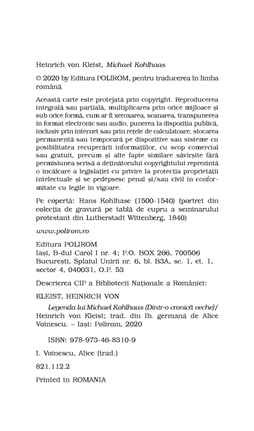 Comandă online cartea "Legenda lui Michael Kohlhaas (Dintr-o cronică veche) (ediție de buzunar)" la 21,10 lei isbn 9789734683109 scrisă de Heinrich von Kleist, tiparită la editura Polirom face parte din colecția Top 10+. Cartea poate fi livrată în circa 2 zile cu plata ramburs sau online cu cardul.