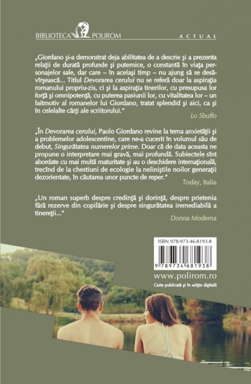 „În Devorarea cerului, Paolo Giordano revine la tema anxietăţii şi a problemelor adolescentine, care ne-a cucerit în volumul său de debut, Singurătatea numerelor prime. Doar că de data aceasta ne propune o interpretare mai gravă, mai profundă. Subiectele sînt abordate cu mai multă maturitate şi au o deschidere internaţională, trecînd de la chestiuni de ecologie la neliniştile noilor generaţii dezorientate, în căutarea unor puncte de reper.” (Today, Italia)