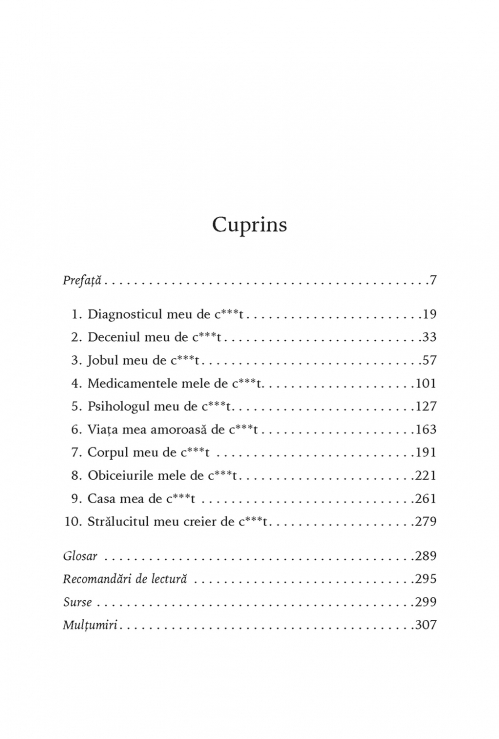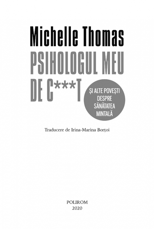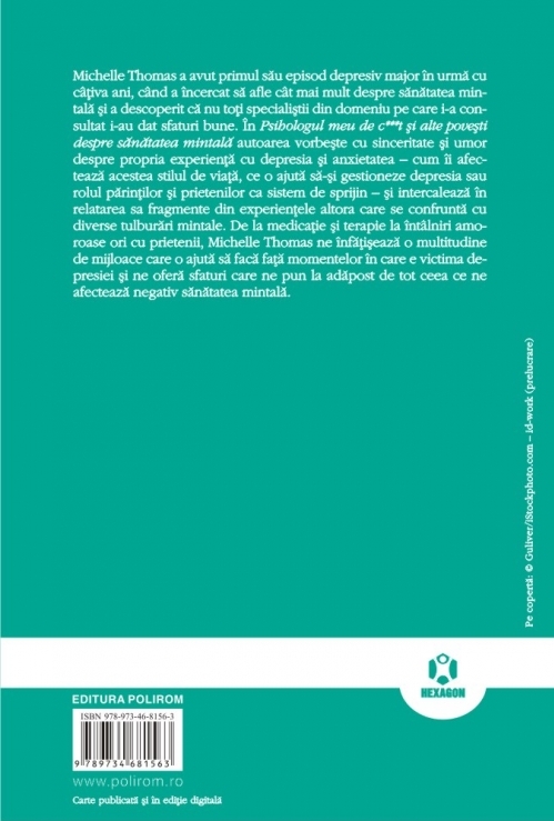 Michelle Thomas a avut primul său episod depresiv major în urmă cu cîțiva ani, cînd a încercat să afle cît mai mult despre sănătatea mintală și a descoperit că nu toți specialiștii din domeniu pe care i-a consultat i-au dat sfaturi bune. În Psihologul meu de c***t și alte povești despre sănătatea mintală autoarea vorbește cu sinceritate și umor despre propria experiență cu depresia și anxietatea – cum îi afectează acestea stilul de viață, ce o ajută să-și gestioneze depresia sau rolul părinților și prietenilor ca sistem de sprijin – și intercalează în relatarea sa fragmente din experiențele altora care se confruntă cu diverse tulburări mintale. De la medicație și terapie la întîlniri amoroase ori cu prietenii, Michelle Thomas ne înfățișează o multitudine de mijloace care o ajută să facă față momentelor în care e victima depresiei și ne oferă sfaturi care ne pun la adăpost de tot ceea ce ne afectează negativ sănătatea mintală.