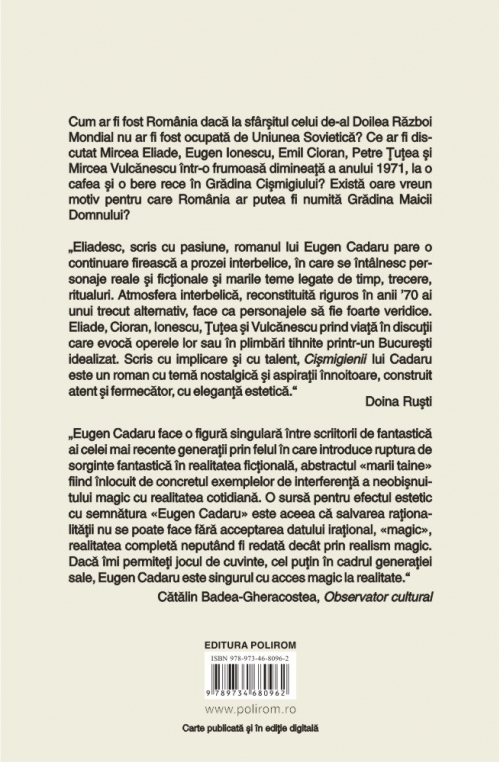 „Eliadesc, scris cu pasiune, romanul lui Eugen Cadaru pare o continuare firească a prozei interbelice, în care se întîlnesc personaje reale și ficționale și marile teme legate de timp, trecere, ritualuri. Atmosfera interbelică, reconstituită riguros în anii ’70 ai unui trecut alternativ, face ca personajele să fie foarte veridice. Eliade, Cioran, Ionescu, Țuțea și Vulcănescu prind viață în discuții care evocă operele lor sau în plimbări tihnite printr-un București idealizat. Scris cu implicare și cu talent, Cișmigienii lui Cadaru este un roman cu temă nostalgică și aspirații înnoitoare, construit atent și fermecător, cu eleganță estetică.” (Doina Ruști)