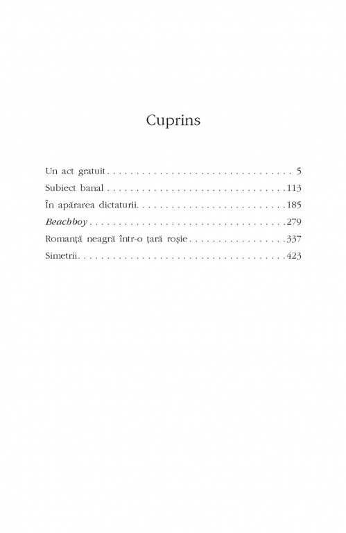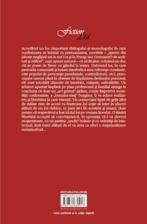 Acordînd un loc important dialogului și monologului în care confesiunea se îmbină cu persuasiunea, nuvelele – „specie din păcate neglijată azi la noi (ca și în Franța sau Germania!) de scriitori și editori”, cum spune autorul – ce alcătuiesc volumul ne duc cît se poate de firesc cu gîndul la teatru. Universul lor, în care perioada comunistă și lumea interbelică sînt referințe constante, este populat de personaje paradoxale, contradictorii, căci, preocupate uneori pînă la obsesie de împlinirea destinului personal, ele sînt totodată chinuite de întrebări, ezitante, nehotărîte. Un arhitect aparent împlinit pe plan profesional și familial ajunge la concluzia că doar un „act gratuit” gidian, comis împotriva societății conformiste, a „bunului-simț” burghez, îi va aduce realizarea și libertatea la care visează. Un comerciant lipsit de grija zilei de mîine este de acord ca frumoasa lui soție să intre în afaceri alături de un ins dubios, ce pare să-i fie acesteia și amant, doar pentru că respectivul a fost idolul lui pe vremea liceului. O tînără libertină acceptă să conviețuiască, în speranța că-i va deveni moștenitoare, cu un pretins „unchi” bolnav și cu veleități de intelectual, însă traiul alături de el va avea ca efect o surprinzătoare metamorfoză...