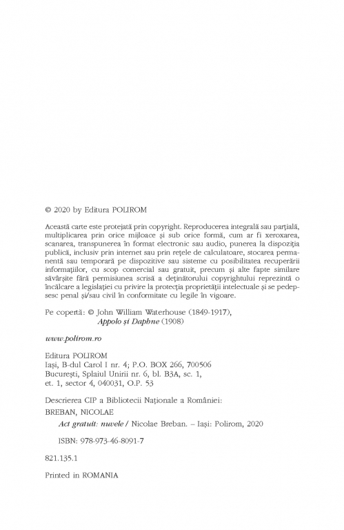 Comandă online cartea "Act gratuit. Nuvele" la 69,74 lei isbn 9789734680917 scrisă de Nicolae Breban, tiparită la editura Polirom face parte din colecția Fiction Ltd. cu plata ramburs sau online cu cardul. Momentan titlul "Act gratuit. Nuvele" nu este disponibil însa vă puteți înscrie pentru a fi notificat în momenul reaprovizionarii.