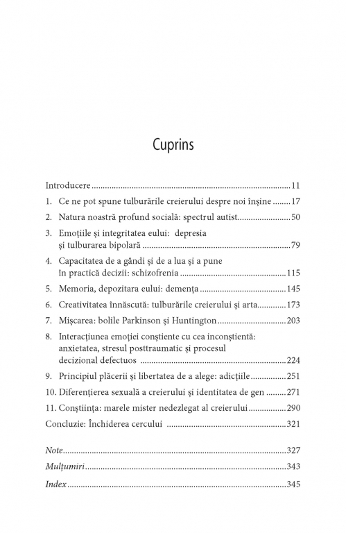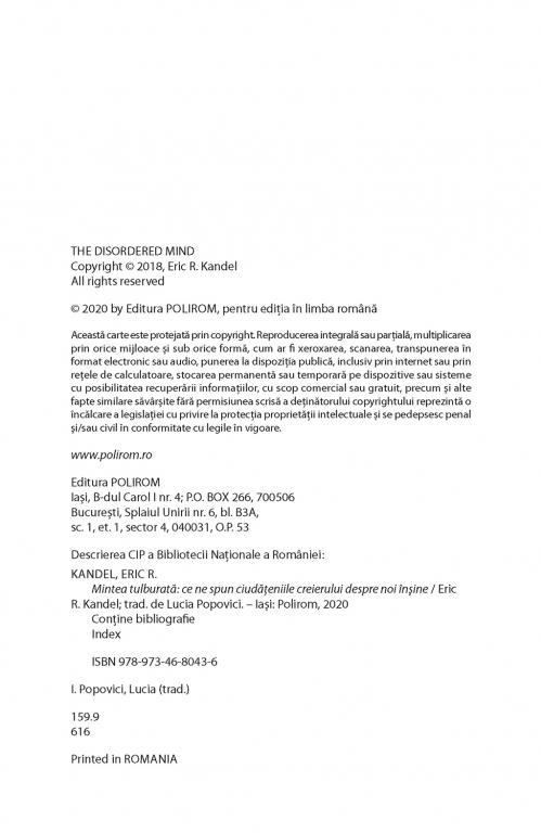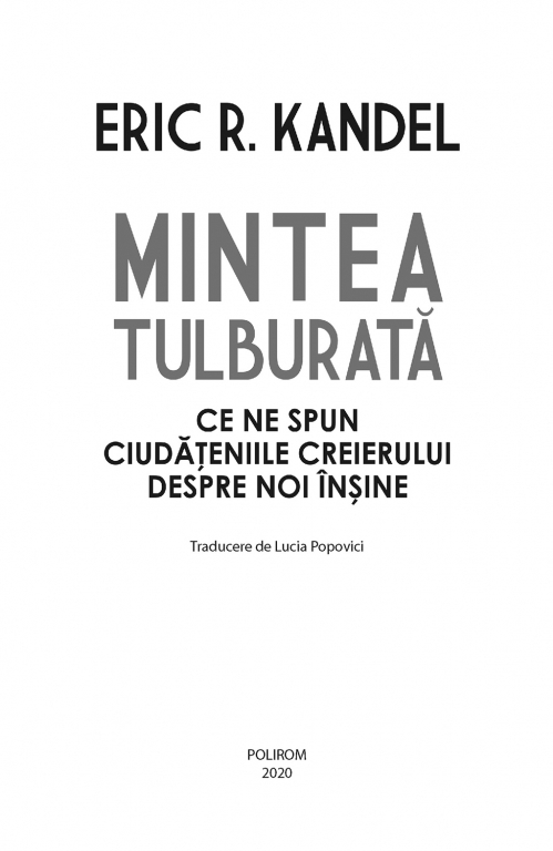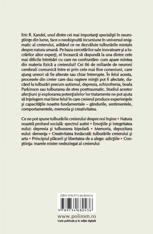 Eric R. Kandel, unul dintre cei mai importanţi specialişti în neuroştiinţe din lume, face o neobişnuită incursiune în universul enigmatic al creierului, arătînd ce ne dezvăluie tulburările mintale despre natura umană. Pe baza cercetărilor sale inovatoare şi a lucrărilor altor experţi, el încearcă să răspundă la una dintre cele mai dificile întrebări cu care ne confruntăm: cum apare mintea din materia fizică a creierului? Cei 86 de miliarde de neuroni cerebrali comunică între ei prin cele mai fine conexiuni, care ajung uneori să fie alterate sau chiar întrerupte. În felul acesta, procesele din creier care dau naştere minţii pot fi afectate, ducînd la tulburări precum autismul, depresia, schizofrenia, boala Parkinson sau tulburarea de stres posttraumatic. Studiul acestor afecţiuni şi explorarea potenţialelor lor tratamente ne pot ajuta să înţelegem mai bine felul în care creierul produce experienţele şi capacităţile noastre fundamentale – gîndurile, sentimentele, comportamentele, memoria şi creativitatea.