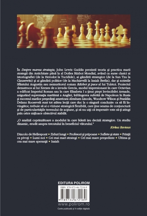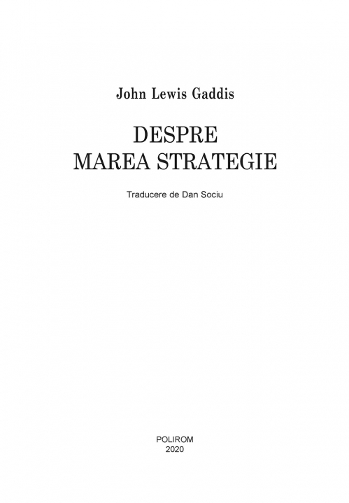 În Despre marea strategie, John Lewis Gaddis prezintă teoria și practica marii strategii din Antichitate pînă la al Doilea Război Mondial, avînd ca surse clasici ai istoriografiei (de la Herodot la Tucidide), ai gîndirii strategice (de la Sun Tzu la Clausewitz) și ai gîndirii politice (de la Machiavelli la Isaiah Berlin), dar și scrierile Sfîntului Augustin sau nemuritorul roman Război și pace al lui Tolstoi. Proiectul dezastruos al lui Xerxes de a invada Grecia, modul impresionant în care Octavian a edificat Imperiul Roman sau în care Elisabeta I a ținut piept Invincibilei Armade, asigurînd supremația maritimă a Angliei, înfrîngerea suferită de Napoleon în Rusia și succesul marilor președinți americani Abraham Lincoln, Woodrow Wilson și Franklin Delano Roosevelt sînt tot atîtea lecții care duc la o singură concluzie: ca să fii învingător, trebuie să ai o viziune strategică flexibilă, care ține seama de conjunctură și de particularitățile terenului de acțiune, și să nu uiți că imperativ este să-ți atingi prin orice mijloace obiectivul stabilit.