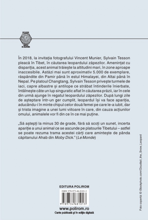 Comandă online cartea "Leopardul zăpezilor" la 15,90 lei isbn 9789734681013 scrisă de Sylvain Tesson, tiparită la editura Polirom face parte din colecția Hexagon. Cartea poate fi livrată în circa 2 zile cu plata ramburs sau online cu cardul.