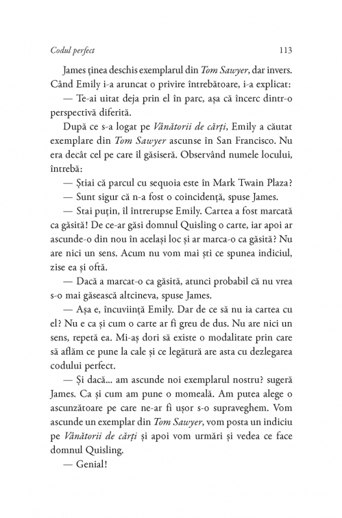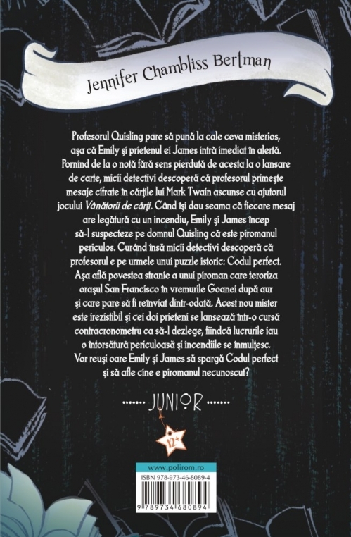 Profesorul Quisling pare să pună la cale ceva misterios, aşa că Emily şi prietenul ei James intră imediat în alertă. Pornind de la o notă fără sens pierdută de acesta la o lansare de carte, micii detectivi descoperă că profesorul primeşte mesaje cifrate în cărţile lui Mark Twain ascunse cu ajutorul jocului Vînătorii de cărți. Cînd îşi dau seama că fiecare mesaj are legătură cu un incendiu, Emily şi James încep să-l suspecteze pe domnul Quisling că este piromanul periculos. Curînd însă micii detectivi descoperă că profesorul e pe urmele unui puzzle istoric: Codul perfect. Aşa află povestea stranie a unui piroman care teroriza oraşul San Francisco în vremurile Goanei după aur şi care pare să fi reînviat dintr-odată. Acest nou mister este irezistibil şi cei doi prieteni se lansează într-o cursă contracronometru ca să-l dezlege, fiindcă lucrurile iau o întorsătură periculoasă şi incendiile se înmulţesc. Vor reuşi oare Emily şi James să spargă Codul perfect şi să afle cine e piromanul necunoscut?