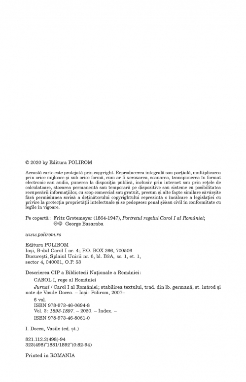 Comandă online cartea "Jurnal. Volumul al III-lea: 1893-1897" la 58,10 lei isbn 9789734680610 scrisă de Carol I al Romaniei, tiparită la editura Polirom face parte din colecția -. Cartea poate fi livrată în circa 2 zile cu plata ramburs sau online cu cardul.