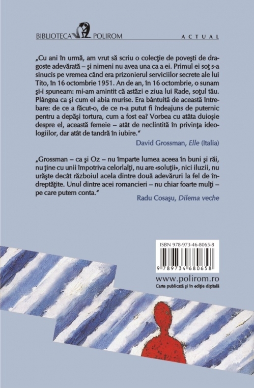 „Cu ani în urmă, am vrut să scriu o colecţie de poveşti de dragoste adevărată – şi nimeni nu avea una ca a ei. Primul ei soţ s-a sinucis pe vremea cînd era prizonierul serviciilor secrete ale lui Tito, în 16 octombrie 1951. An de an, în 16 octombrie, o sunam şi-i spuneam: mi-am amintit că astăzi e ziua lui Rade, soţul tău. Plîngea ca şi cum el abia murise. Era bîntuită de această întrebare: de ce a făcut-o, de ce n-a putut fi îndeajuns de puternic pentru a depăşi tortura, cum a fost ea? Vorbea cu atîta duioşie despre el, această femeie – atît de neclintită în privinţa ideologiilor, dar atît de tandră în iubire.” David Grossman, Elle (Italia)