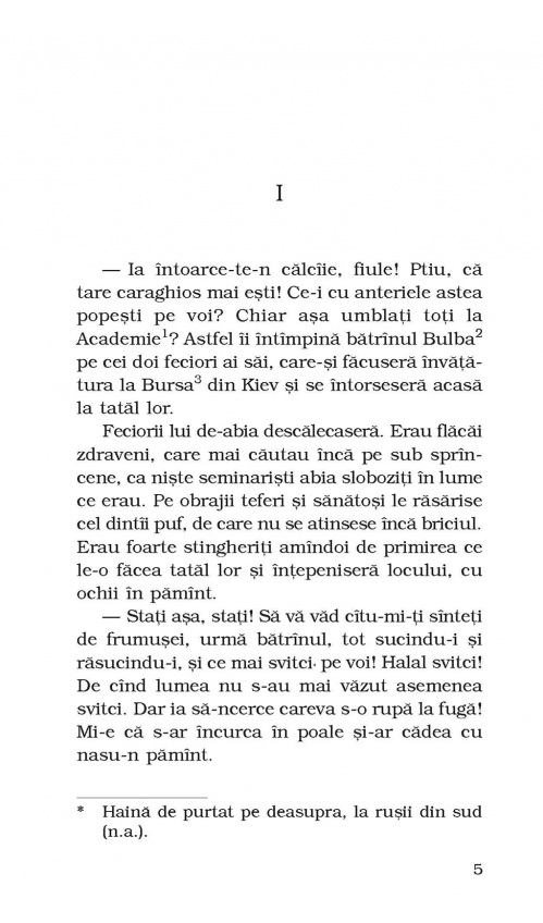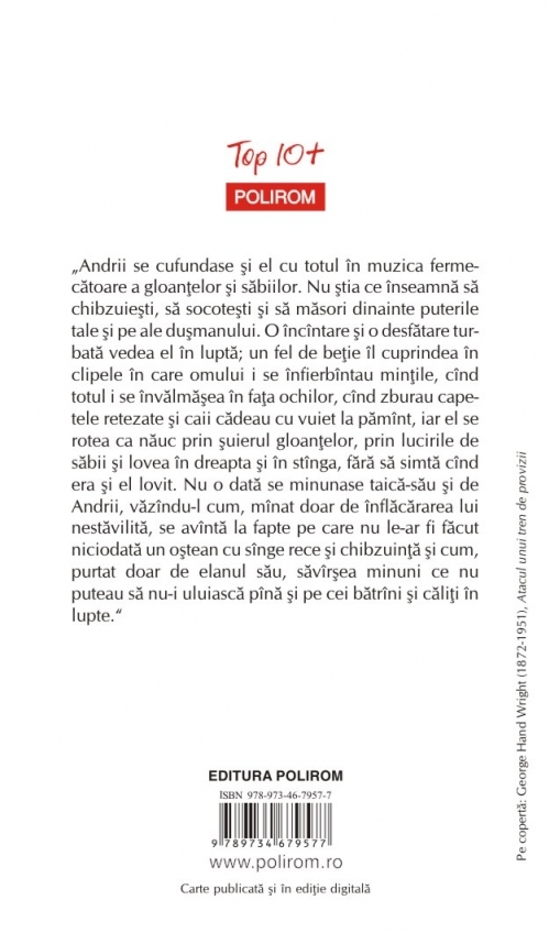 „Andrii se cufundase şi el cu totul în muzica fermecătoare a gloanţelor şi săbiilor. Nu ştia ce înseamnă să chibzuieşti, să socoteşti şi să măsori dinainte puterile tale şi pe ale duşmanului. O încîntare şi o desfătare turbată vedea el în luptă; un fel de beţie îl cuprindea în clipele în care omului i se înfierbîntau minţile, cînd totul i se învălmăşea în faţa ochilor, cînd zburau capetele retezate şi caii cădeau cu vuiet la pămînt, iar el se rotea ca năuc prin şuierul gloanţelor, prin lucirile de săbii şi lovea în dreapta şi în stînga, fără să simtă cînd era şi el lovit. Nu o dată se minunase taică-său şi de Andrii, văzîndu-l cum, mînat doar de înflăcărarea lui nestăvilită, se avîntă la fapte pe care nu le-ar fi făcut niciodată un oştean cu sînge rece şi chibzuinţă şi cum, purtat doar de elanul său, săvîrşea minuni ce nu puteau să nu-i uluiască pînă şi pe cei bătrîni şi căliţi în lupte.”