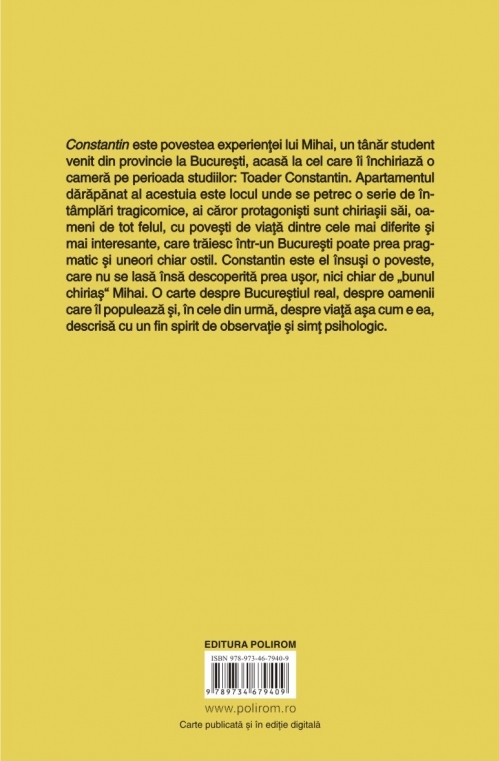 Constantin este povestea experienței lui Mihai, un tînăr student venit din provincie la București, acasă la cel care i-a închiriat o cameră pe perioada studiilor: Toader Constantin. În apartamentul dărăpănat al acestuia se petrec o serie de întîmplări tragicomice, ai căror protagoniști sînt chiriașii săi, oameni de tot felul, cu povești de viață dintre cele mai diferite și mai interesante, care trăiesc într-un București poate prea pragmatic și uneori chiar ostil. Constantin este el însuși o poveste, care nu se lasă însă descoperită prea ușor, nici chiar de „bunul chiriaș” Mihai. O carte despre Bucureștiul real, despre oamenii care îl populează și, în cele din urmă, despre viață așa cum e ea, descrisă cu un fin spirit de observație și simț psihologic.