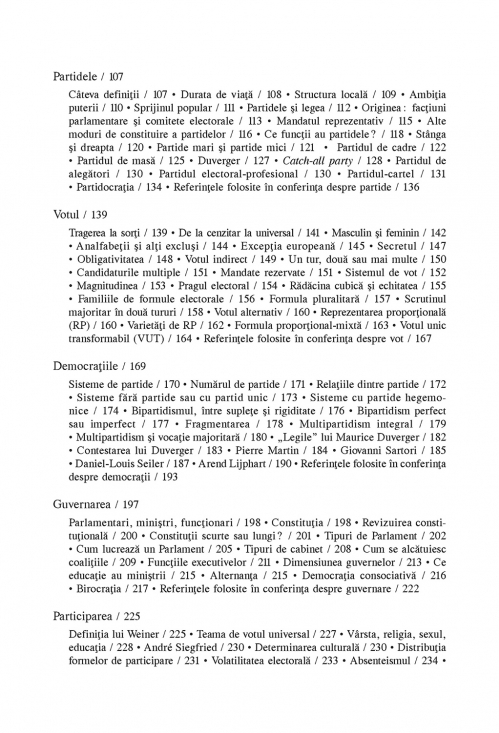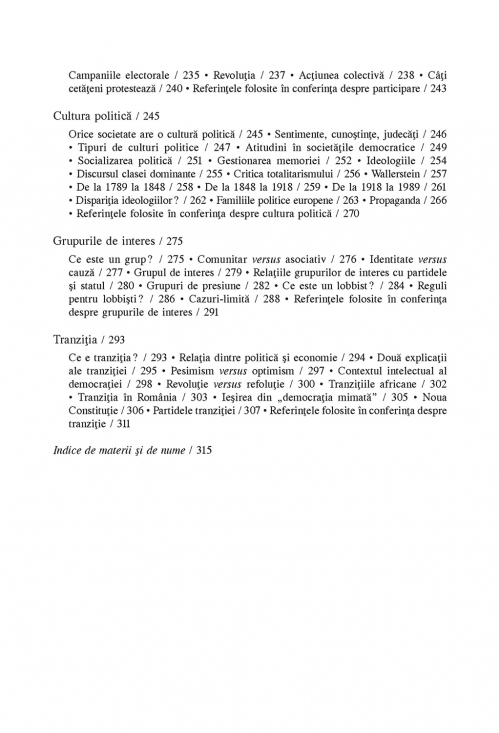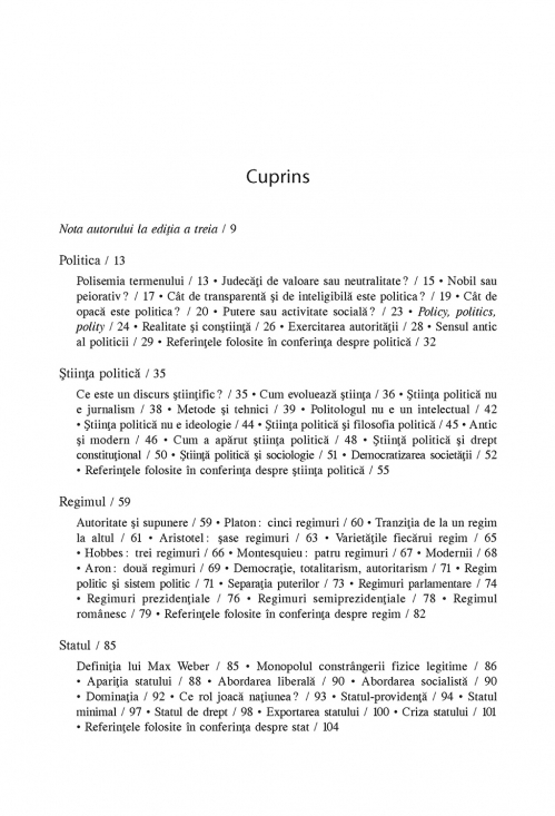 De ce există guverne? Cum funcţionează acestea? Avem nevoie de partide politice? Dincolo de momentul alegerilor, pot cetăţenii să influenţeze deciziile liderilor lor? Sînt doar cîteva dintre întrebările esenţiale la care această introducere în materia clasică a ştiinţei politice oferă răspunsuri. Cele mai importante instrumente analitice necesare pentru a explica funcţionarea regimurilor politice, ca şi principalele teme ce permit o mai bună înţelegere a societăţilor contemporane sunt discutate pe baza referirilor la textele fundamentale ale ştiinţei politice. Construit în jurul unor concepte-cheie des uzitate, dar ale căror înţelesuri rămîn insuficient cunoscute publicului larg, volumul e un excelent instrument de lucru atît pentru studenţii în ştiinţe politice, cît şi pentru jurnalişti şi toţi cei interesaţi de viaţa politică în general.