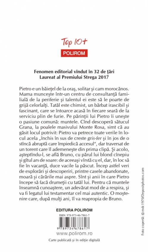 Pietro e un băieţel de la oraş, solitar şi cam morocănos. Mama munceşte într-un centru de consultanţă familială de la periferie şi talentul ei este să le poarte de grijă celorlalţi. Tatăl este chimist, un bărbat irascibil şi fascinant, care se întoarce acasă în fiecare seară de la serviciu plin de furie. Pe părinţii lui Pietro îi uneşte o pasiune comună: muntele. Cînd descoperă sătucul Grana, la poalele masivului Monte Rosa, simt că au găsit locul potrivit: Pietro va petrece toate verile în locul acela „închis în sus de creste gris-fer şi în jos de o stîncă abruptă care împiedică accesul”, dar traversat de un torent care îl ademeneşte din prima clipă. Şi acolo, aşteptîndu-l, se află Bruno, cu părul lui blond cînepiu şi gîtul ars de soare: de aceeaşi vîrstă cu el, dar, în loc să fie în vacanţă, duce vacile la păscut. Încep astfel veri de explorări şi descoperiri, printre casele abandonate, moară şi cărările mai aspre. Sînt şi anii în care Pietro începe să facă drumeţii cu tatăl lui. Pentru că muntele înseamnă cunoaştere, un adevărat mod de a respira, şi va fi legatul lui testamentar cel mai autentic. O moştenire care, după mulţi ani, îl va reapropia de Bruno.
