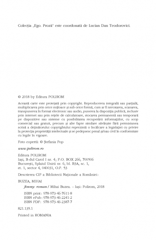 Comandă online cartea "Jimmy" la 10,60 lei isbn 9789734676118 scrisă de Mihai Buzea, tiparită la editura Polirom face parte din colecția Ego. Proza. Cartea poate fi livrată în circa 2 zile cu plata ramburs sau online cu cardul.