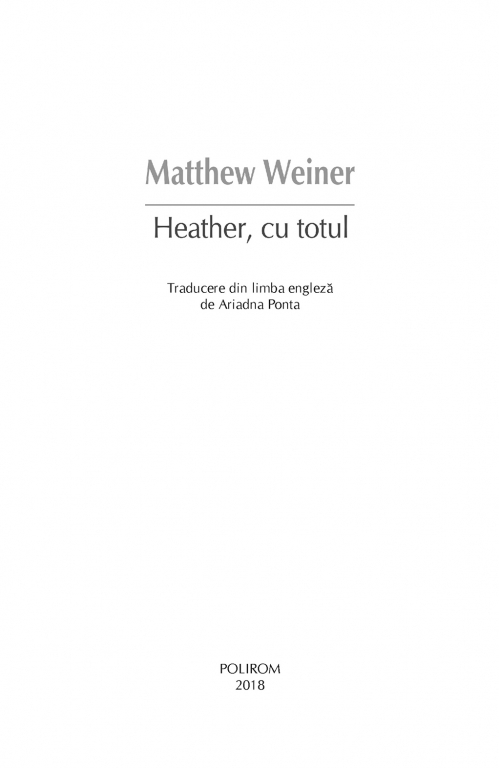 Comandă online cartea "Heather, cu totul" la 10,60 lei isbn 9789734675593 scrisă de Matthew Weiner, tiparită la editura Polirom face parte din colecția BIBLIOTECA POLIROM -> Actual. Cartea poate fi livrată în circa 2 zile cu plata ramburs sau online cu cardul.