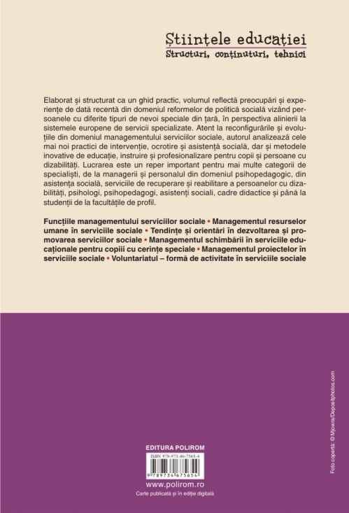 Elaborat şi structurat ca un ghid practic, volumul reflectă preocupări şi experienţe de dată recentă din domeniul reformelor de politică socială vizînd persoanele cu diferite tipuri de nevoi speciale din ţară, în perspectiva alinierii la sistemele europene de servicii specializate. Atent la reconfigurările şi evoluţiile din domeniul managementului serviciilor sociale, autorul analizează cele mai noi practici de intervenţie, ocrotire şi asistenţă socială, dar şi metodele inovative de educaţie, instruire şi profesionalizare pentru copii şi persoane cu dizabilităţi. Lucrarea este un reper important pentru mai multe categorii de specialişti, de la managerii şi personalul din domeniul psihopedagogic, din asistenţa socială, serviciile de recuperare şi reabilitare a persoanelor cu dizabilităţi, psihologi, psihopedagogi, asistenţi sociali, cadre didactice şi pînă la studenţii de la facultăţile de profil.