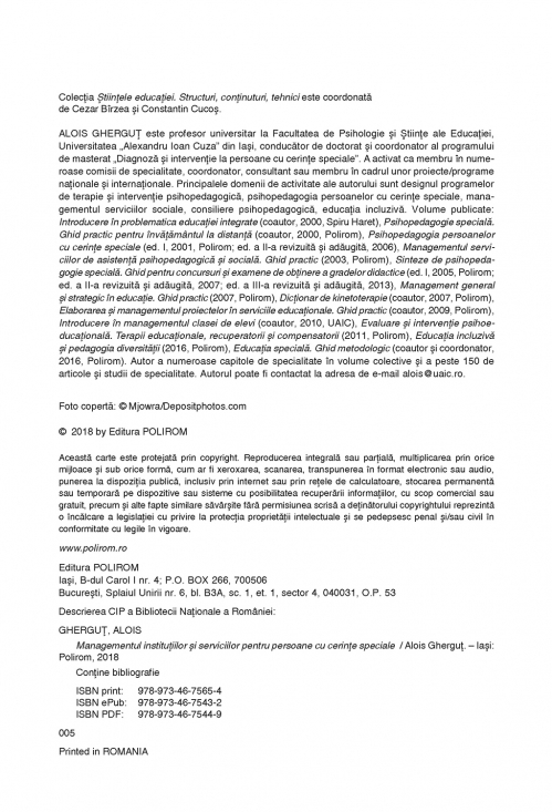 Comandă online cartea "Managementul instituţiilor şi serviciilor pentru persoane cu cerinţe speciale" la 47,50 lei isbn 9789734675654 scrisă de Alois Ghergut, tiparită la editura Polirom face parte din colecția STIINTELE EDUCATIEI -> Structuri, continuturi, tehnici. Cartea poate fi livrată în circa 2 zile cu plata ramburs sau online cu cardul.