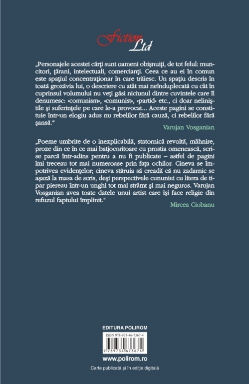 „Personajele acestei cărţi sînt oameni obişnuiţi, de tot felul: muncitori, ţărani, intelectuali, comercianţi. Ceea ce au ei în comun este spaţiul concentraţionar în care trăiesc. Un spaţiu descris în toată grozăvia lui, o descriere cu atît mai neînduplecată cu cît în cuprinsul volumului nu veţi găsi niciunul dintre cuvintele care îl denumesc: «comunism», «comunist», «partid» etc., ci doar neliniştile şi suferinţele pe care le-a provocat... Aceste pagini se constituie într-un elogiu adus nu rebelilor fără cauză, ci rebelilor fără şansă.” (Varujan Vosganian)