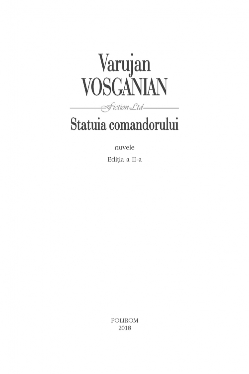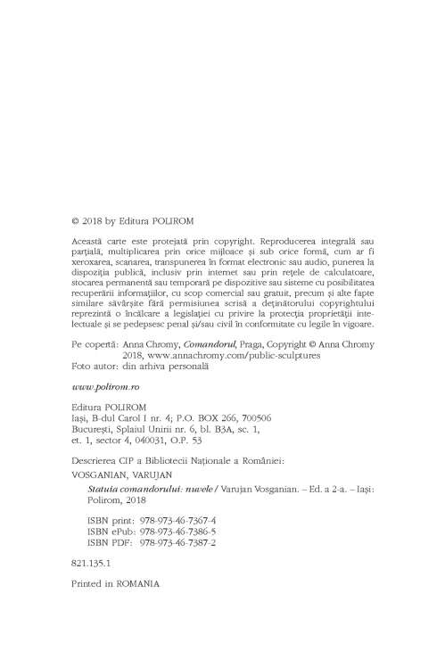 Comandă online cartea "Statuia comandorului" la 47,50 lei isbn 9789734673674 scrisă de Varujan Vosganian, tiparită la editura Polirom face parte din colecția Fiction Ltd. Cartea poate fi livrată în circa 5 zile cu plata ramburs sau online cu cardul.