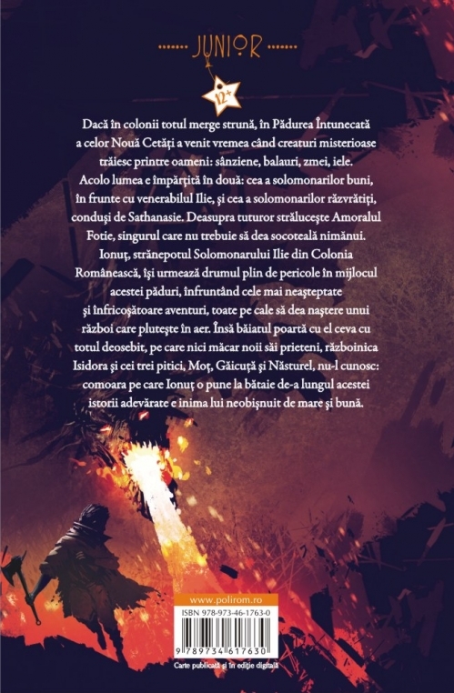 Dacă în colonii totul merge strună, în Pădurea Întunecată a celor Nouă Cetăţi a venit vremea cînd creaturi misterioase trăiesc printre oameni: sînziene, balauri, zmei, iele. Acolo lumea e împărţită în două: cea a solomonarilor buni, în frunte cu venerabilul Ilie, şi cea a solomonarilor răzvrătiţi, conduşi de Sathanasie. Deasupra tuturor străluceşte Amoralul Fotie, singurul care nu trebuie să dea socoteală nimănui. Ionuţ, strănepotul Solomonarului Ilie din Colonia Românească, îşi urmează drumul plin de pericole în mijlocul acestei păduri, înfruntînd cele mai neaşteptate şi înfricoşătoare aventuri, toate pe cale să dea naştere unui război care pluteşte în aer. Însă băiatul poartă cu el ceva cu totul deosebit, pe care nici măcar noii săi prieteni, războinica Isidora şi cei trei pitici, Moţ, Găicuţă şi Năsturel, nu-l cunosc: comoara pe care Ionuţ o pune la bătaie de-a lungul acestei istorii adevărate e inima lui neobişnuit de mare şi bună.