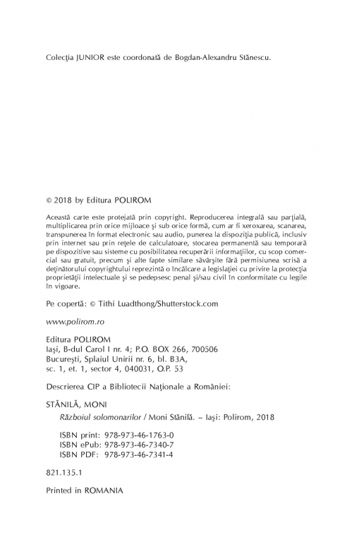 Comandă online cartea "Războiul solomonarilor" la 40,59 lei isbn 9789734617630 scrisă de Moni Stanila, tiparită la editura Polirom face parte din colecția JUNIOR. cu plata ramburs sau online cu cardul. Momentan titlul "Războiul solomonarilor" nu este disponibil însa vă puteți înscrie pentru a fi notificat în momenul reaprovizionarii.