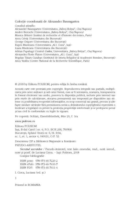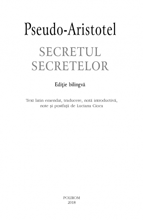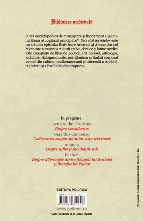 Comandă online cartea "Secretul secretelor (ediţie bilingvă)" la 52,80 lei isbn 9789734672202 scrisă de Pseudo-Aristotel, tiparită la editura Polirom face parte din colecția Biblioteca Medievala. Cartea poate fi livrată în circa 5 zile cu plata ramburs sau online cu cardul.