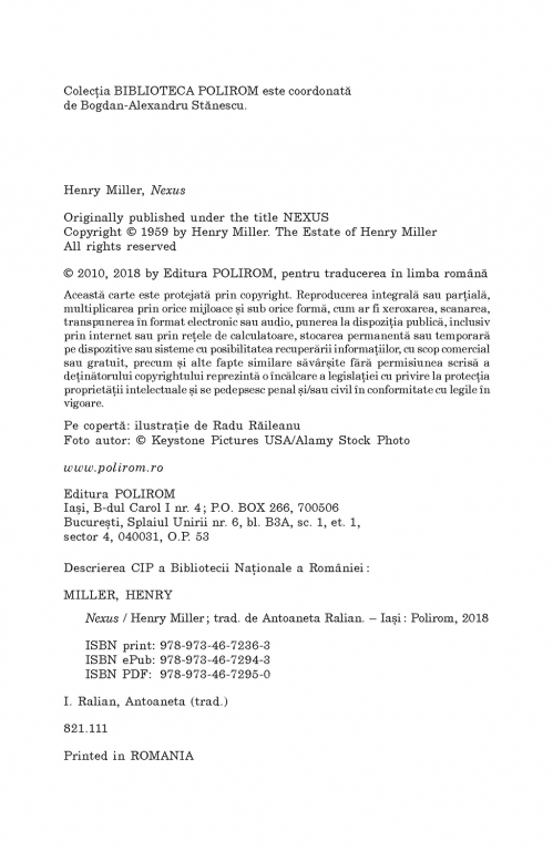 Comandă online cartea "Nexus (ediţia 2018)" la 47,50 lei isbn 9789734672363 scrisă de Henry Miller, tiparită la editura Polirom face parte din colecția BIBLIOTECA POLIROM -> Seria de autor "Henry Miller". Cartea poate fi livrată în circa 2 zile cu plata ramburs sau online cu cardul.