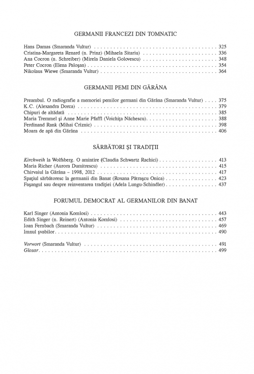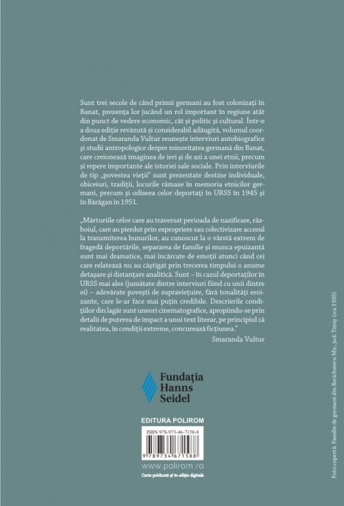 Sînt trei secole de cînd primii germani au fost colonizaţi în Banat, prezenţa lor jucînd un rol important în regiune atît din punct de vedere economic, cît şi politic şi cultural. Într-o a doua ediție revăzută și considerabil adăugită, volumul coordonat de Smaranda Vultur reuneşte interviuri autobiografice şi studii antropologice despre minoritatea germană din Banat, care creionează imaginea de ieri şi de azi a unei etnii, precum şi repere importante ale istoriei sale sociale. Prin interviurile de tip „povestea vieţii” sînt prezentate destine individuale, obiceiuri, tradiții, locurile rămase în memoria etnicilor germani, precum şi odiseea celor deportaţi în URSS în 1945 şi în Bărăgan în 1951.
