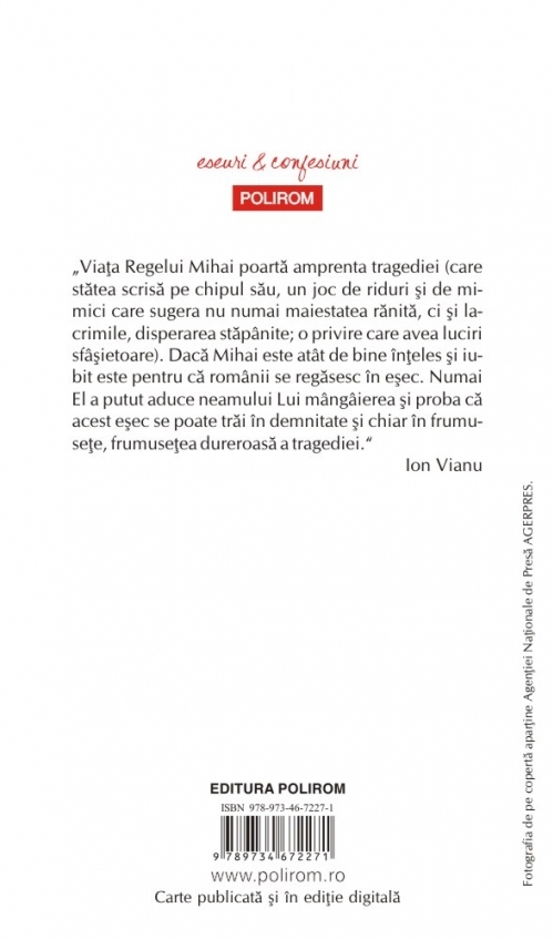 „Viaţa Regelui Mihai poartă amprenta tragediei (care stătea scrisă pe chipul său, un joc de riduri şi de mimici care sugera nu numai maiestatea rănită, ci şi lacrimile, disperarea stăpînite; o privire care avea luciri sfîşietoare). Dacă Mihai este atît de bine înţeles şi iubit este pentru că românii se regăsesc în eşec. Numai El a putut aduce neamului Lui mîngîierea şi proba că acest eşec se poate trăi în demnitate şi chiar în frumuseţe, frumuseţea dureroasă a tragediei” (Ion Vianu)
