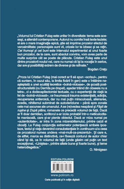 „Volumul lui Cristian Fulaş este unitar în diversitate: tema este aceeaşi, a alienării contemporane. Autorul nu comite însă texte teziste; el are o mare imaginaţie epică, ştie să imprime prozelor efectul de verosimilitate: personajele sînt vii, crizele lor te izbesc şi se reţin. Cei frumoşi şi cei buni este intervalul experimental al unui foarte bun prozator, de la care, sînt absolut convins, vom avea parte de multe surprize cît se poate de plăcute. Cristian Fulaş este unul dintre prozatorii noului val, care nu numai că îşi ia vocaţia în serios, dar are şi posibilităţi extrem de diverse şi de rafinate.” (Bogdan Creţu)