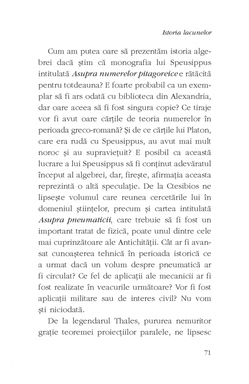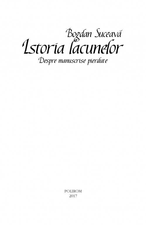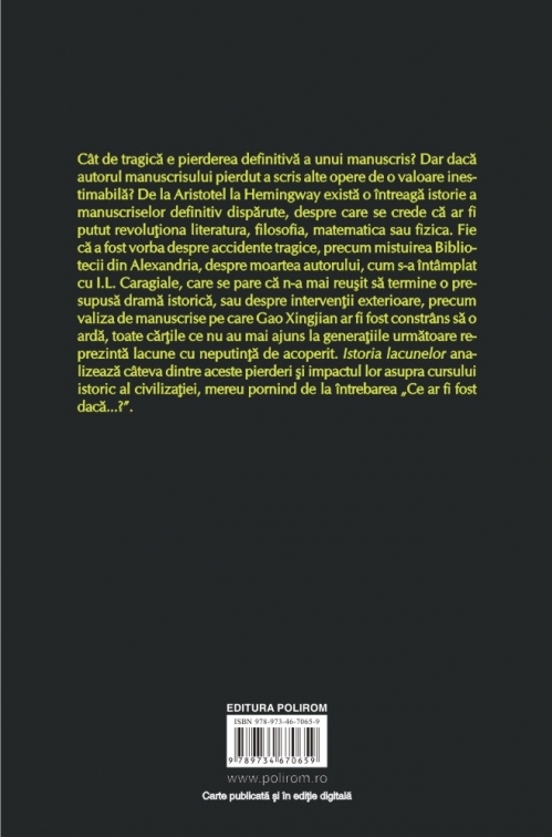 Cît de tragică e pierderea definitivă a unui manuscris? Dar dacă autorul manuscrisului pierdut a scris alte opere de o valoare inestimabilă? De la Aristotel la Hemingway există o întreagă istorie a manuscriselor definitiv dispărute, despre care se crede că ar fi putut revoluţiona literatura, filosofia, matematica sau fizica. Fie că a fost vorba despre accidente tragice, precum mistuirea Bibliotecii din Alexandria, despre moartea autorului, cum s-a întîmplat cu I.L. Caragiale, care se pare că n-a mai reuşit să termine o presupusă dramă istorică, sau despre intervenţii exterioare, precum valiza de manuscrise pe care Gao Xingjian ar fi fost constrîns să o ardă, toate cărţile ce nu au mai ajuns la generaţiile următoare reprezintă lacune cu neputinţă de acoperit. Istoria lacunelor analizează cîteva dintre aceste pierderi şi impactul lor asupra cursului istoric al civilizaţiei, mereu pornind de la întrebarea „Ce ar fi fost dacă...?”.