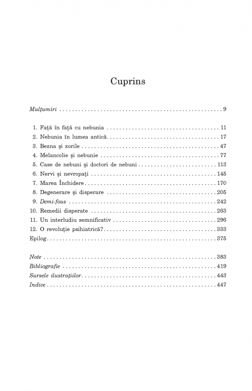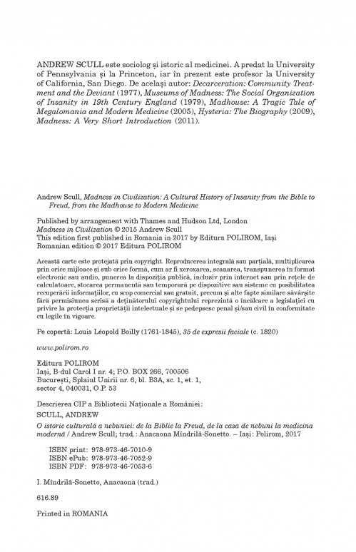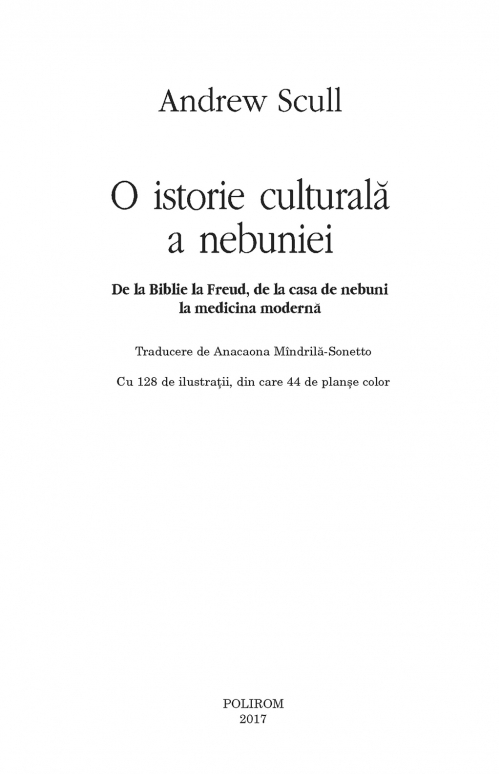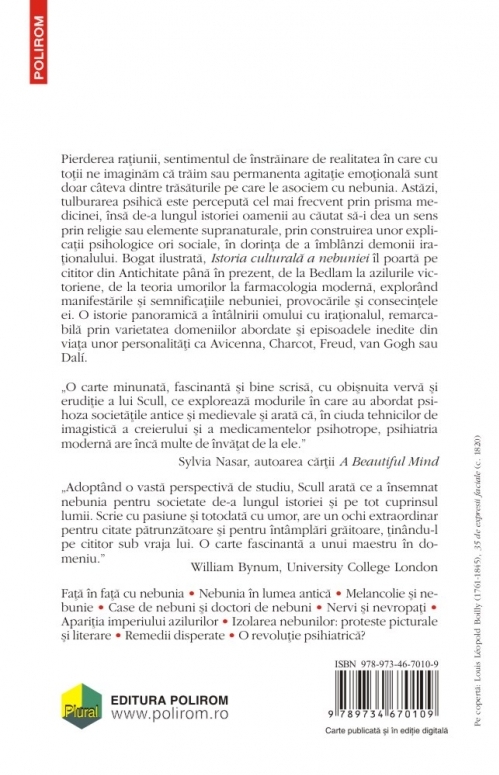 Pierderea raţiunii, sentimentul de înstrăinare de realitatea în care cu toţii ne imaginăm că trăim sau permanenta agitaţie emoţională sînt doar cîteva dintre trăsăturile pe care le asociem cu nebunia. Astăzi, tulburarea psihică este percepută cel mai frecvent prin prisma medicinei, însă de-a lungul istoriei oamenii au căutat să-i dea un sens prin religie sau elemente supranaturale, prin construirea unor explicaţii psihologice ori sociale, în dorinţa de a îmblînzi demonii iraţionalului. Bogat ilustrată, Istoria culturală a nebuniei îl poartă pe cititor din Antichitate pînă în prezent, de la Bedlam la azilurile victoriene, de la teoria umorilor la farmacologia modernă, explorînd manifestările şi semnificaţiile nebuniei, provocările şi consecinţele ei. O istorie panoramică a întîlnirii omului cu iraţionalul, remarcabilă prin varietatea domeniilor abordate şi episoadele inedite din viaţa unor personalităţi ca Avicenna, Charcot, Freud, van Gogh sau Dalí.