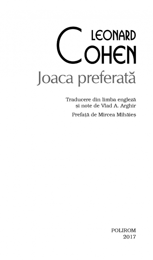 Joaca preferată este prima carte prin care celebrul cîntăreţ Leonard Cohen se anunţă ca romancier. Tipic prin elementele autobiografice, romanul iese din normele convenţionale datorită modului în care autorul concepe „joaca” personajelor sale. Detalii reale compun circumstanţe fictive, figurile feminine şi diverse alte obsesii care domină bună parte din versurile lui Cohen îşi află aici preistoria caleidoscopică. Pe de o parte, roman al despărţirii de tinereţe, al momentului în care memoria devine mai importantă decît încrederea în nemurire, Joaca preferată depăşeşte, pe de altă parte, linearitatea printr-o viziune abisală, în care autorul îşi priveşte cu un umor sec şi tandru ironicul personaj-scriitor-cîntăreţ, vorbind despre sine la persoana a treia şi scriind sau trăind o proză parcă bazată pe un jurnal lucid al obsesiilor şi căutărilor poetului real şi fictiv.