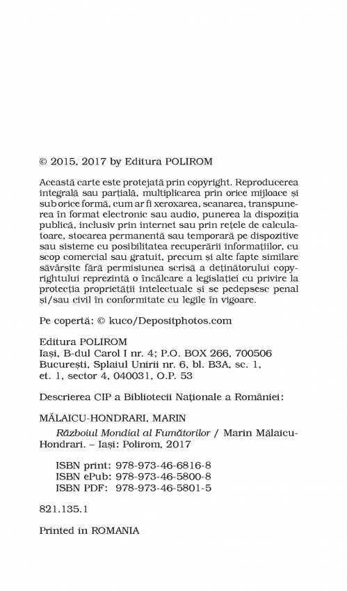 Comandă online cartea "Războiul Mondial al Fumătorilor (ediţie de buzunar)" la 19,69 lei isbn 9789734668168 scrisă de Marin Mălaicu-Hondrari, tiparită la editura Polirom face parte din colecția Top 10+. cu plata ramburs sau online cu cardul. Momentan titlul "Războiul Mondial al Fumătorilor (ediţie de buzunar)" nu este disponibil însa vă puteți înscrie pentru a fi notificat în momenul reaprovizionarii.