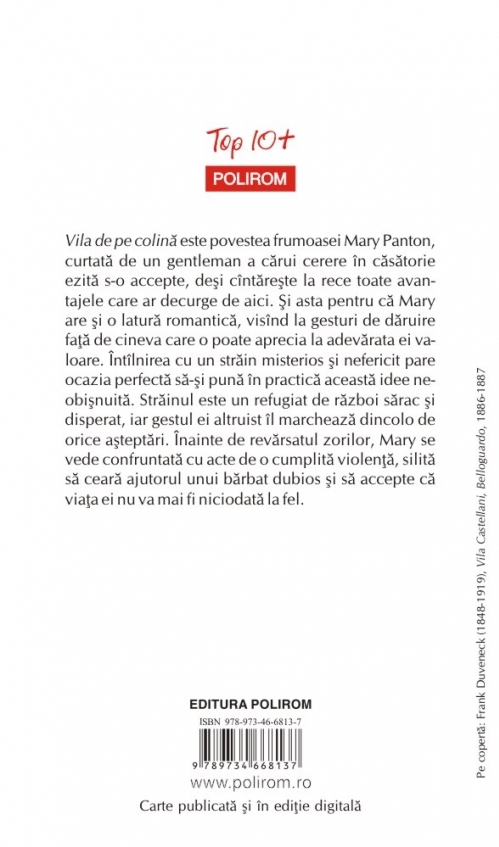 Vila de pe colină este povestea frumoasei Mary Panton, curtată de un gentleman a cărui cerere în căsătorie ezită s-o accepte, deşi cîntăreşte la rece toate avantajele care ar decurge de aici. Şi asta pentru că Mary are şi o latură romantică, visînd la gesturi de dăruire faţă de cineva care o poate aprecia la adevărata ei valoare. Întîlnirea cu un străin misterios şi nefericit pare ocazia perfectă să-şi pună în practică această idee neobişnuită. Străinul este un refugiat de război sărac şi disperat, iar gestul ei altruist îl marchează dincolo de orice aşteptări. Înainte de revărsatul zorilor, Mary se vede confruntată cu acte de o cumplită violenţă, silită să ceară ajutorul unui bărbat dubios şi să accepte că viaţa ei nu va mai fi niciodată la fel.