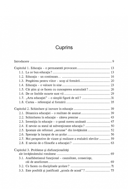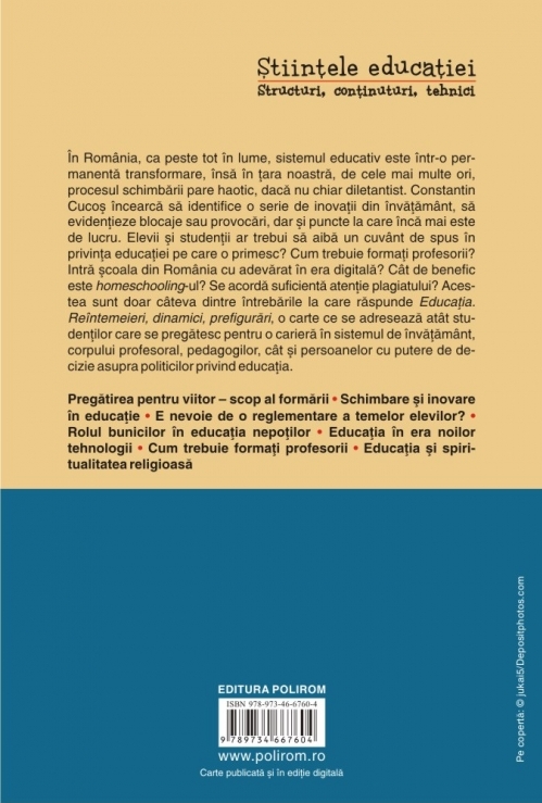În România, ca peste tot în lume, sistemul educativ este într-o permanentă transformare, însă în ţara noastră, de cele mai multe ori, procesul schimbării pare haotic, dacă nu chiar diletantist. Constantin Cucoş încearcă să identifice o serie de inovaţii din învăţămînt, să evidenţieze blocaje sau provocări, dar şi puncte la care încă mai este de lucru. Elevii şi studenţii ar trebui să aibă un cuvînt de spus în privinţa educaţiei pe care o primesc? Cum trebuie formaţi profesorii? Intră şcoala din România cu adevărat în era digitală? Cît de benefic este homeschooling-ul? Se acordă suficientă atenţie plagiatului? Acestea sînt doar cîteva dintre întrebările la care răspunde Educaţia. Reîntemeieri, dinamici, prefigurări, o carte ce se adresează atît studenţilor care se pregătesc pentru o carieră în sistemul de învăţămînt, corpului profesoral, pedagogilor, cît şi persoanelor cu putere de decizie asupra politicilor privind educaţia.