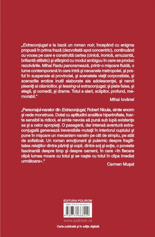 „Personajul-narator din Extraconjugal, Robert Nicula, simte enorm şi vede monstruos. Dotat cu aptitudini analitice hipertrofiate, foarte sensibil la ridicol, el simte nevoia să pună sub lupă existenţa sa şi a celor apropiaţi. O pasageră, dar intensă aventură extraconjugală generează ireversibile mutaţii în interiorul cuplului şi pune în mişcare un mecanism narativ pe cît de simplu, pe atît de sofisticat. Un roman emoţionant şi puternic despre fragilitatea relaţiilor dintre părinţi şi copii, dintre soţ şi soţie, o poveste fascinantă despre timp şi despre oameni, în care «în fiecare clipă lumea moare cu totul şi se naşte cu totul în clipa imediat următoare».” (Carmen Muşat)