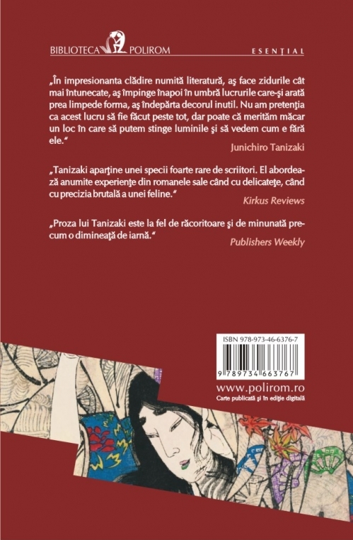 „În impresionanta clădire numită literatură, aş face zidurile cît mai întunecate, aş împinge înapoi în umbră lucrurile care-şi arată prea limpede forma, aş îndepărta decorul inutil. Nu am pretenţia ca acest lucru să fie făcut peste tot, dar poate că merităm măcar un loc în care să putem stinge luminile şi să vedem cum e fără ele.” (Junichiro Tanizaki)