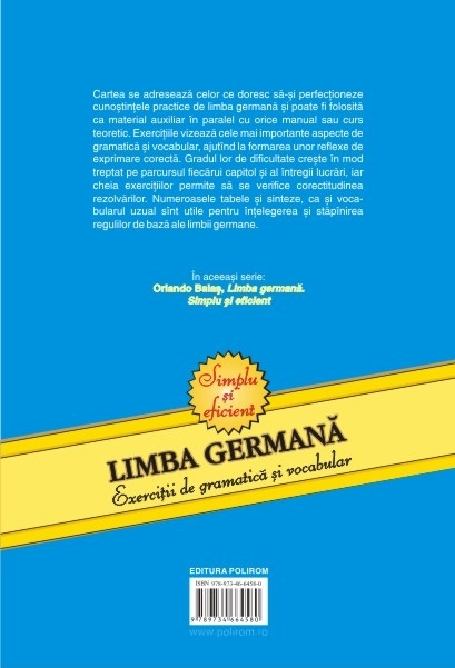 Cartea se adresează celor ce doresc să-şi perfecţioneze cunoştinţele practice de limba germană şi poate fi folosită ca material auxiliar în paralel cu orice manual sau curs teoretic. Exerciţiile vizează cele mai importante aspecte de gramatică şi vocabular, ajutînd la formarea unor reflexe de exprimare corectă. Gradul lor de dificultate creşte în mod treptat pe parcursul fiecărui capitol şi al întregii lucrări, iar cheia exerciţiilor permite să se verifice corectitudinea rezolvărilor. Numeroasele tabele şi sinteze, ca şi vocabularul uzual sînt utile pentru înţelegerea şi stăpînirea regulilor de bază ale limbii germane.