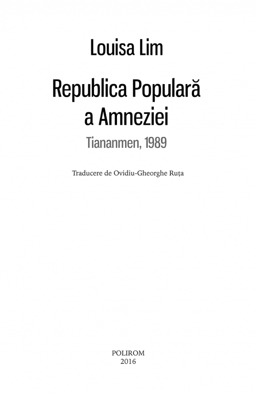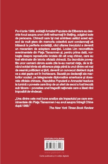 Pe 4 iunie 1989, soldaţii Armatei Populare de Eliberare au deschis focul asupra unor civili neînarmaţi în Beijing, ucigînd sute de persoane. Chinezii care îşi mai amintesc astăzi acest episod de mult şters din memoria colectivă sînt condamnaţi să trăiască la periferia societăţii, căci uitarea trecutului a devenit un mecanism de adaptare esenţial. Louisa Lim reconstituie evenimentele din Piaţa Tiananmen şi, pentru prima dată, vorbeşte despre represiunile brutale din alt oraş chinez, care au fost eliminate din istoria oficială chineză. Ea dezvăluie poveştile unor oameni cărora acele zile le-au marcat viaţa, de la tînărul soldat trimis să elibereze piaţa pînă la unul dintre cei mai de seamă politicieni ai ţării, devenit un cunoscut disident după ce a stat şapte ani în închisoare. Bazată pe declaraţii ale martorilor oculari, pe telegramele diplomatice americane şi dosarele oficiale chineze, Republica Populară a Amneziei readuce la lumină o poveste care timp de un sfert de secol a fost trecută sub tăcere – povestea unei tragedii naţionale care a lăsat răni imposibil de vindecat.
