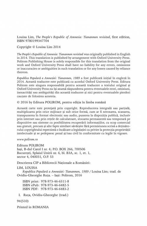 Comandă online cartea "Republica Populară a Amneziei. Tiananmen, 1989" la 10,60 lei isbn 9789734663118 scrisă de Louisa Lim, tiparită la editura Polirom face parte din colecția -. Cartea poate fi livrată în circa 2 zile cu plata ramburs sau online cu cardul.