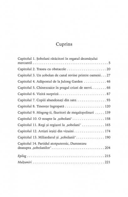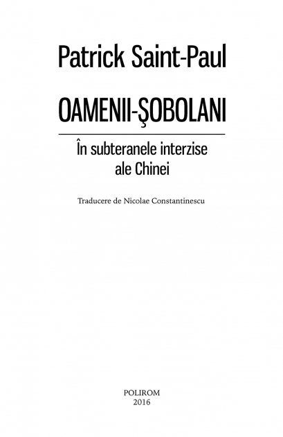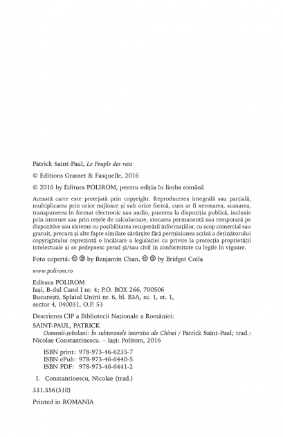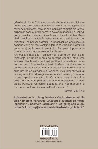 Am fost să-i întîlnesc în canalele din Beijing. Am trăit, cu intermitenţe, alături de ei timp de aproape doi ani: într-o lume interzisă, fără ferestre, fără apă şi căldură, luminată de neoane. I-am urmat în satele lor de baştină. M-am dus să văd zecile de milioane de copii pe care i-au părăsit acolo. Pentru că ei sînt încarnarea paradoxurilor chineze. Visul preşedintelui Xi Jinping, apostolul ideologiei maoiste, este un miraj îndepărtat în ţara capitalismului sălbatic. Viaţa lor e departe de a fi un basm. Dar nu sînt pregătiţi să răstoarne sistemul... Propaganda Partidului Comunist, speranţa unei vieţi mai bune şi reînvierea confucianismului au făcut «minuni».” (Patrick Saint-Paul)