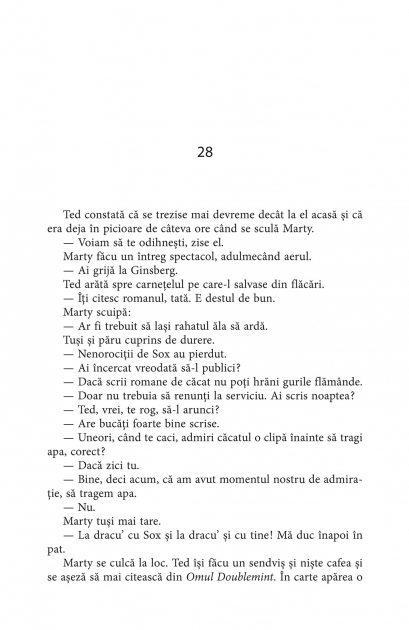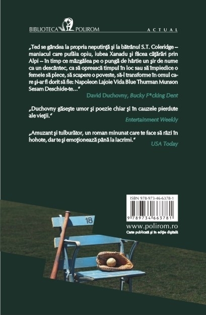 „Ted se gîndea la propria neputinţă şi la bătrînul S.T. Coleridge – maniacul care pufăia opiu, iubea Xanadu şi făcea căţărări prin Alpi – în timp ce mîzgălea pe o pungă de hîrtie un şir de nume ca un descîntec, ca să oprească timpul în loc sau să împiedice o femeie să plece, să scapere o poveste, să-l transforme în omul care şi-ar fi dorit să fie: Napoleon Lajoie Vida Blue Thurman Munson Sesam Deschide-te…” (David Duchovny, Bucky F*cking Dent)