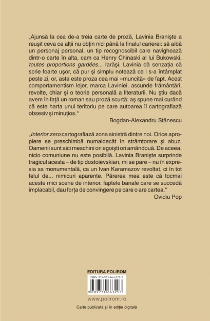 „Interior zero cartografiază zona sinistră dintre noi. Orice apropiere se preschimbă numaidecît în strîmtorare şi abuz. Oamenii sînt aici meschini ori egoişti ori amîndouă. De aceea, nicio comuniune nu este posibilă. Lavinia Branişte surprinde tragicul acesta – de tip dostoievskian, mi se pare – nu în expresia sa monumentală, ca un Ivan Karamazov revoltat, ci în tot felul de... nimicuri aparente. Părerea mea este că tocmai aceste mici scene de interior, faptele banale care se succedă implacabil, dau forţa de convingere pe care o are cartea.” (Ovidiu Pop)