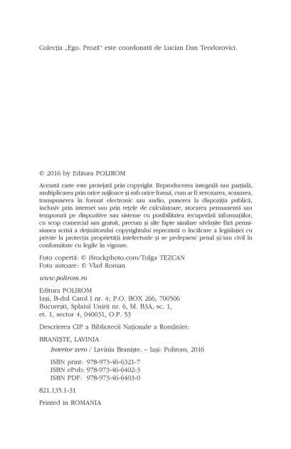 Comandă online cartea "Interior zero" la 45,00 lei isbn 9789734663217 scrisă de Lavinia Braniste, tiparită la editura Polirom face parte din colecția Ego. Proza. Cartea poate fi livrată în circa 2 zile cu plata ramburs sau online cu cardul.