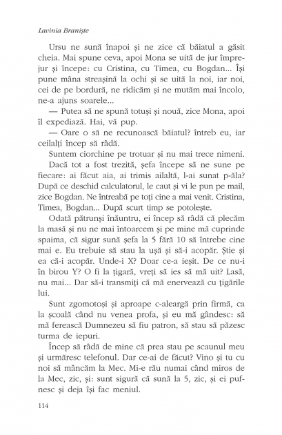 „Ajunsă la cea de-a treia carte de proză, Lavinia Branişte a reuşit ceva ce alţii nu obţin nici pînă la finalul carierei: să aibă un personaj personal, un tip recognoscibil care navighează dintr-o carte în alta, cam ca Henry Chinaski al lui Bukowski, toutes proportions gardées... Iarăşi, Lavinia dă senzaţia că scrie foarte uşor, că pur şi simplu notează ce i s-a întîmplat peste zi, or, asta este proza cea mai «muncită» de fapt. Acest comportamentism lejer, marca Laviniei, ascunde frămîntări, revolte, chiar şi o teorie personală a literaturii. Nu ştiu dacă avem în faţă un roman sau proză scurtă: aş spune mai curînd că este harta unui teritoriu pe care autoarea îl cartografiază obsesiv şi minuţios.” (Bogdan-Alexandru Stănescu)