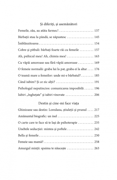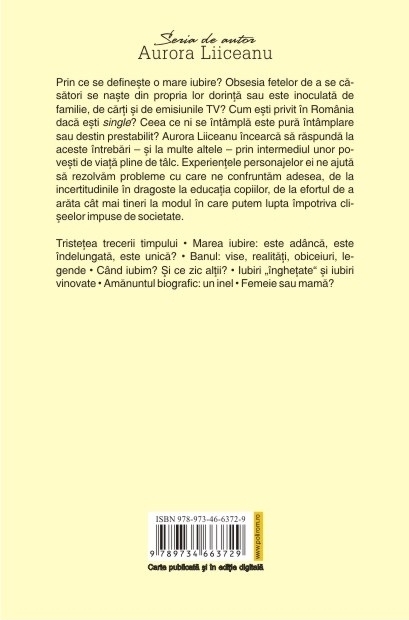 Prin ce se defineşte o mare iubire? Obsesia fetelor de a se căsători se naşte din propria lor dorinţă sau este inoculată de familie, de cărţi şi de emisiunile TV? Cum eşti privit în România dacă eşti single? Ceea ce ni se întîmplă este pură întîmplare sau destin prestabilit? Aurora Liiceanu încearcă să răspundă la aceste întrebări – şi la multe altele – prin intermediul unor poveşti de viaţă pline de tîlc. Experienţele personajelor ei ne ajută să rezolvăm probleme cu care ne confruntăm adesea, de la incertitudinile în dragoste la educaţia copiilor, de la efortul de a arăta cît mai tineri la modul în care putem lupta împotriva clişeelor impuse de societate.