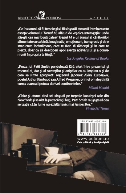 Volum de amintiri atipic, Trenul M este, în esenţă, o poveste despre curgerea vieţii, relatată de o legendă a muzicii punk rock americane. Fie că vorbeşte despre rutina ei newyorkeză sau despre legăturile cu artişti precum William Burroughs sau Paul Bowles, Patti Smith rememorează pentru a înțelege, în acordurile unei melancolii temperate, ale unui umor subtil. Proza ei împleteşte realitatea cu visul şi încearcă să le descifreze rostul amîndurora; tînjeşte după cafeneaua perfectă şi după soţul ei decedat; merge pe urmele marilor artişti care i-au marcat existenţa, în căutarea unui adevăr profund; susţine concerte şi conferinţe, scrie, bea mereu cafea – drogul ei declarat – şi are vise obsesive. Dar ceea ce captivează în primul rînd în acest volum este personalitatea complexă a autoarei, ce reuşeşte să îşi apropie cititorul şi să îl facă părtaş la căutările, întrebările şi răspunsurile ei, care definesc umanitatea.